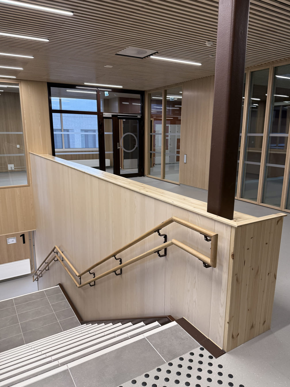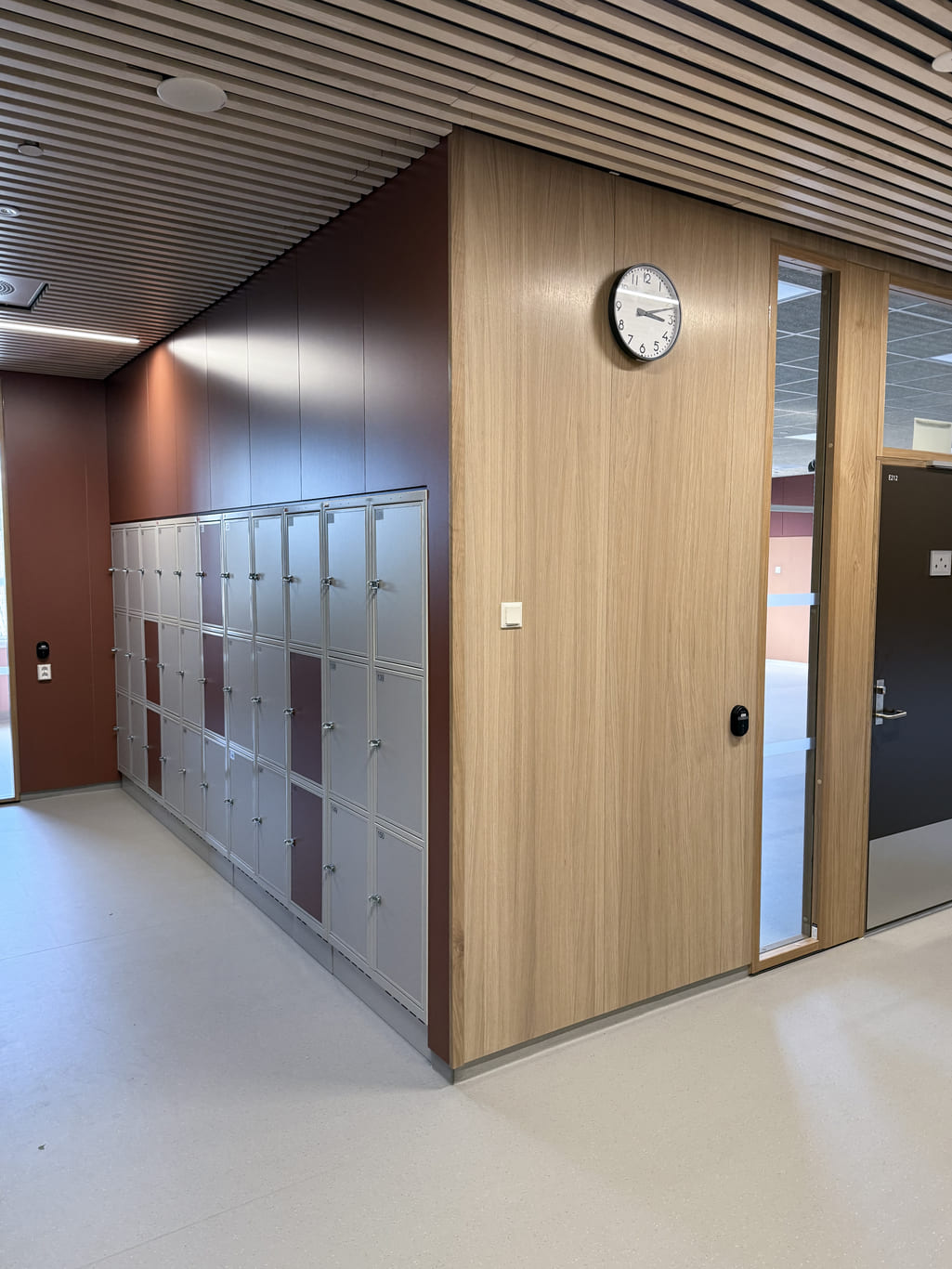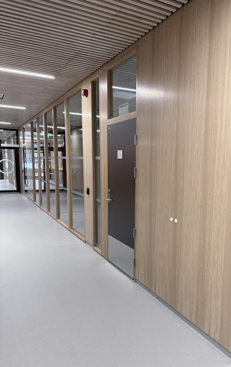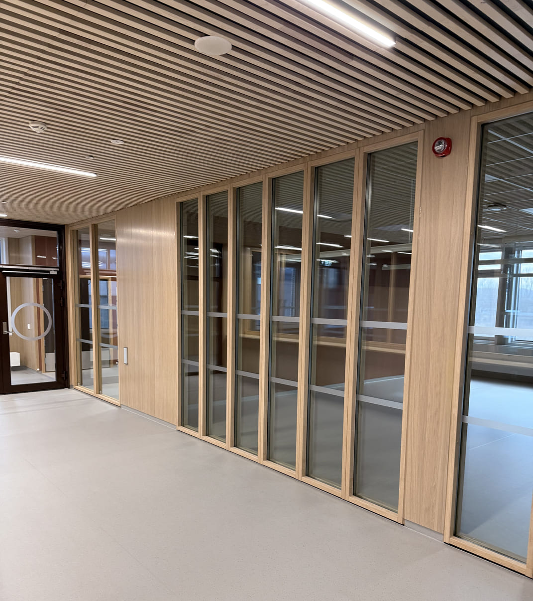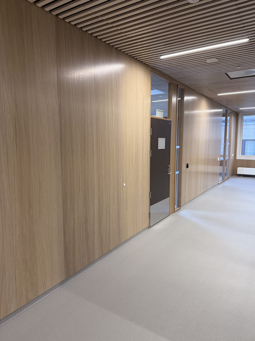 Otretek har produsert, levert og montert store mengder veggpaneler med not og fjær samt skjult innfesting – noe som gir et sømløst og elegant uttrykk. Hele leveransen er overflatebehandlet på vår egen lakklinje i fabrikken, for et enhetlig og profesjonelt resultat. Alle panelene er behandlet med brannlakk for å oppfylle kravene til brannklasse B-s1,d0 – en trygg løsning godt egnet for offentlige miljøer.