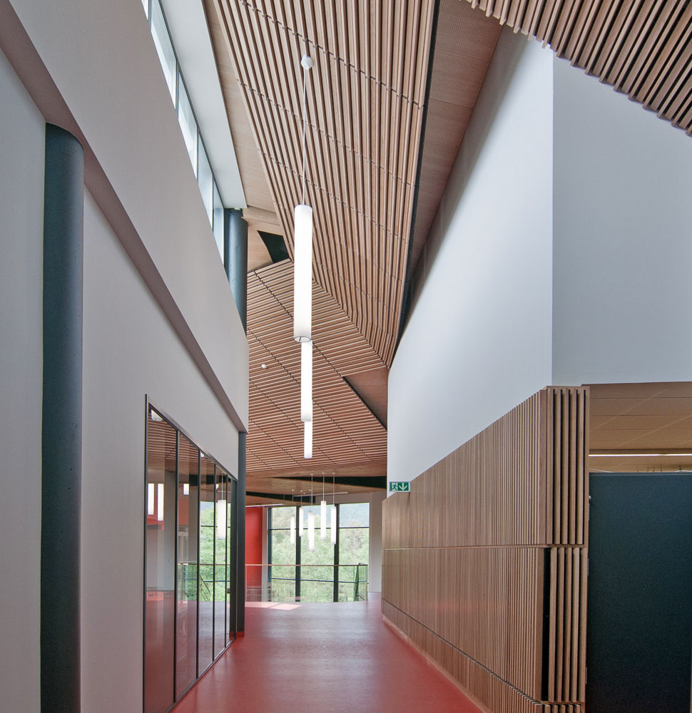 Spilevegger i eik til sentralrom/hjerterommet, utviklet for å gi varme, naturlige flater med gode akustiske egenskaper