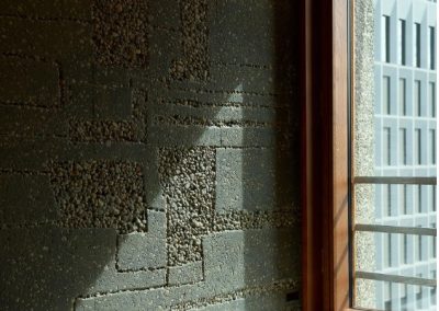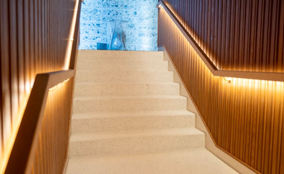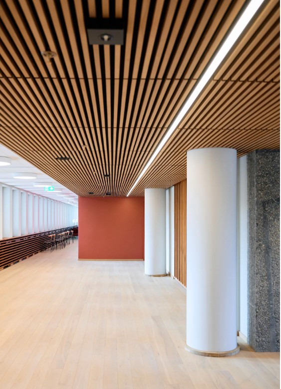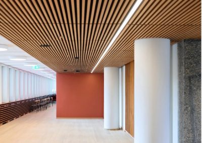 Vegger i gangareal kledd med 20 mm limtre eik, brannlakk B-s1-d0, beiset i «kirsebær».
