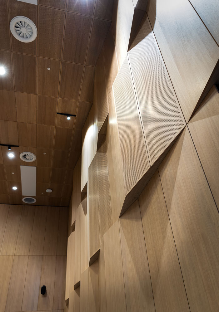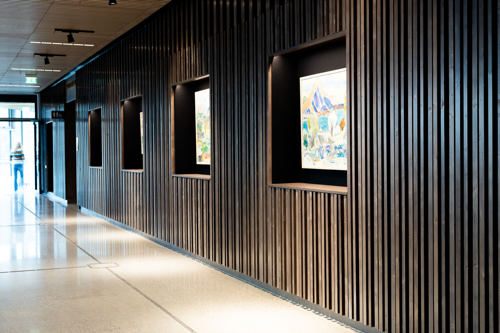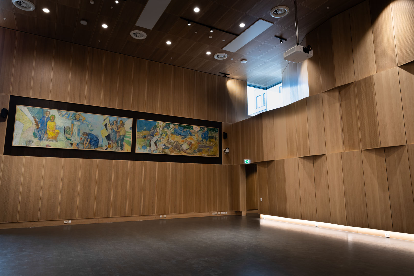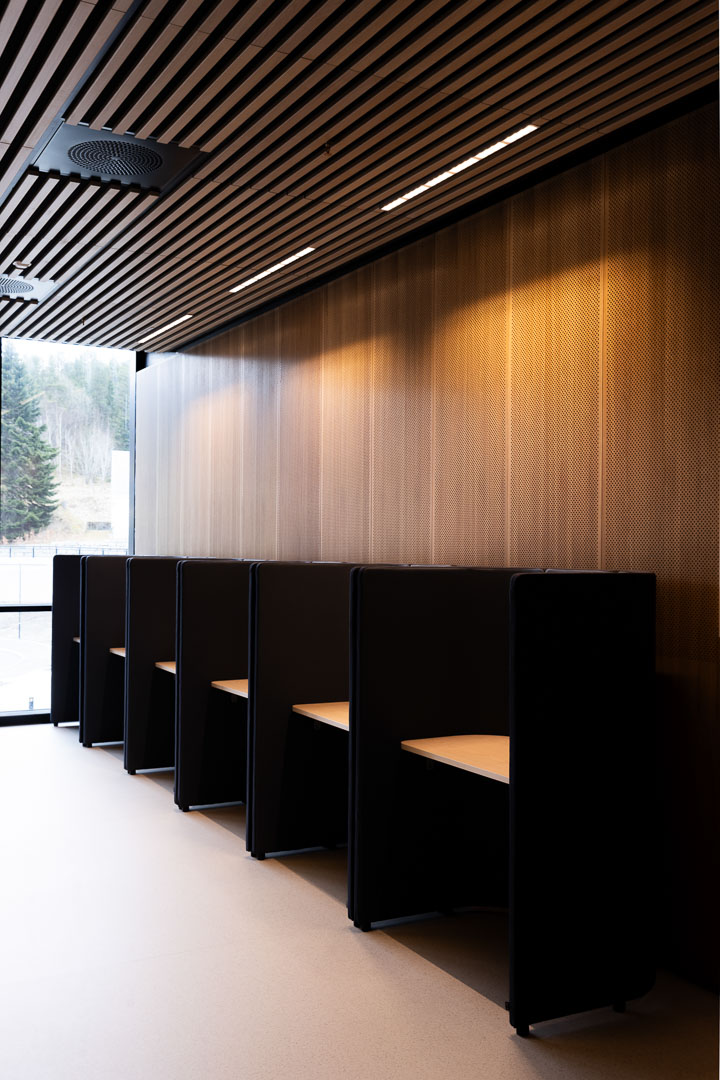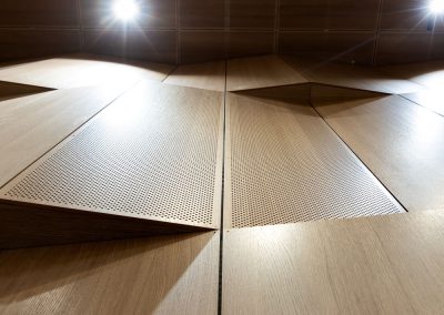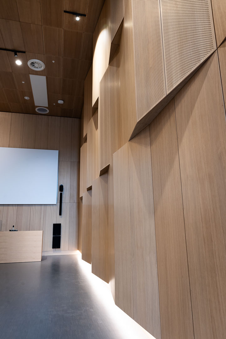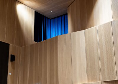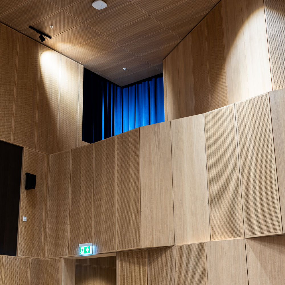 Auditoriet utmerker seg med sin unike arkitektur, hvor Otretek har montert perforerte og glatte plater på kassetter i spesielle vinkler. Dette skaper både et visuelt særpreg og et behagelig lydmiljø. I tillegg har vi levert veggpaneler med tredimensjonale mønstre i seremoni- og visningsrom, som bidrar til både estetikk og akustikk.