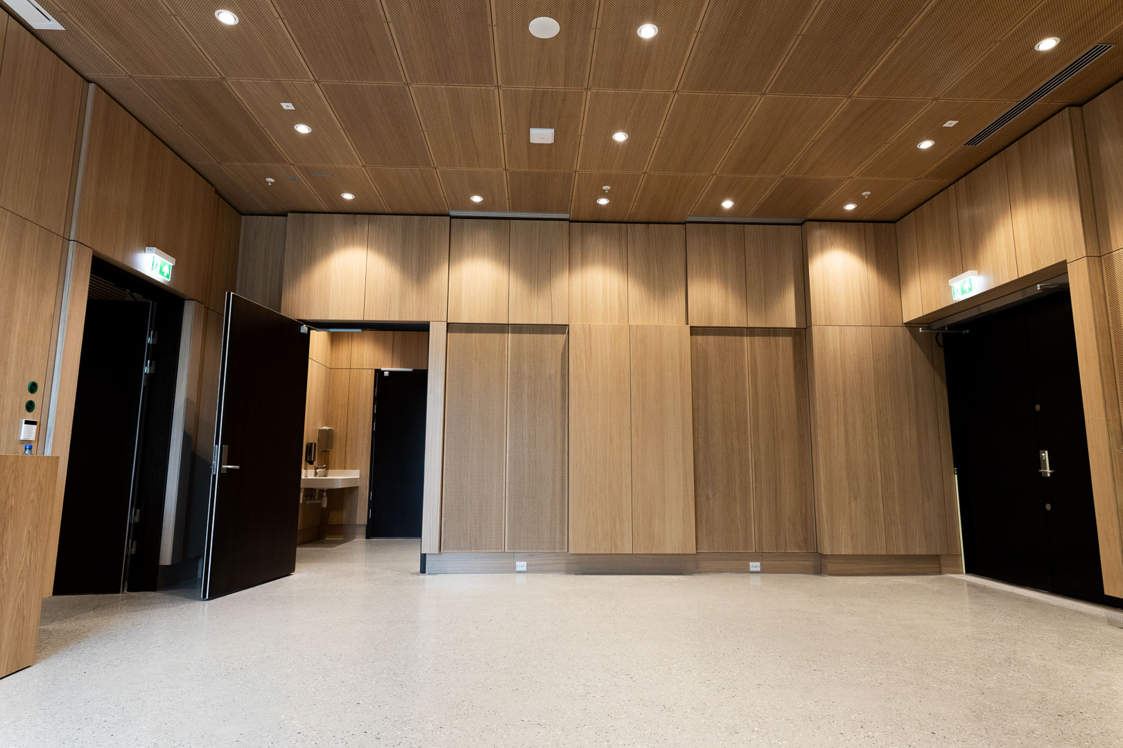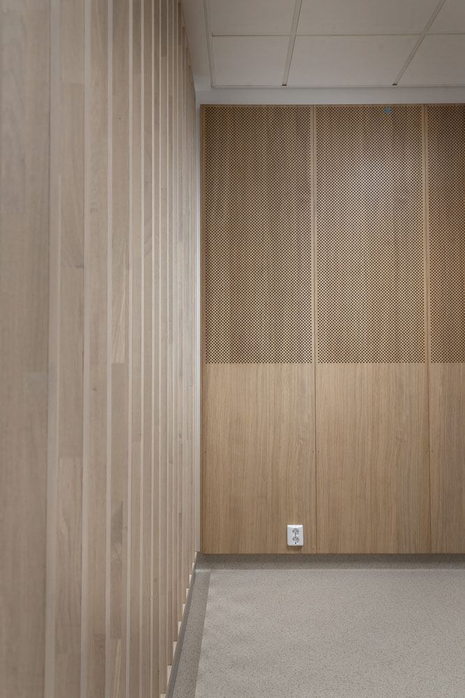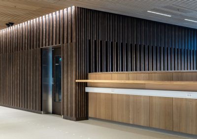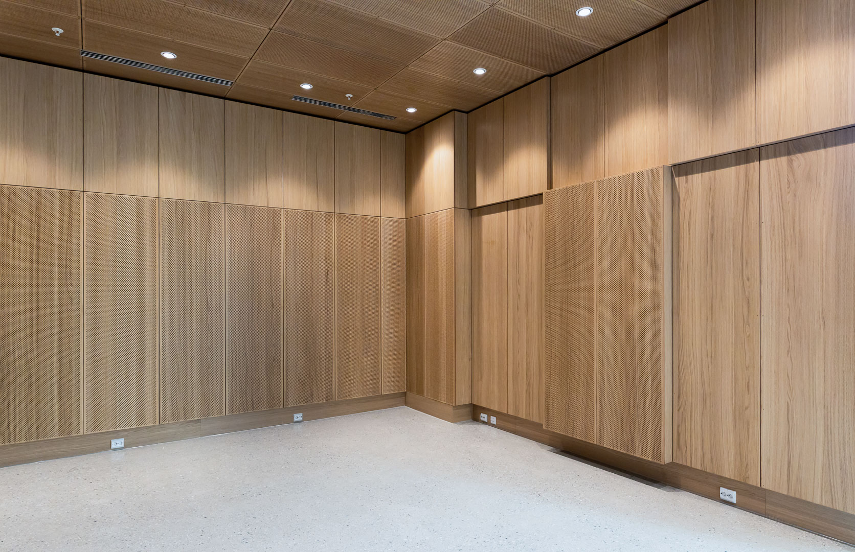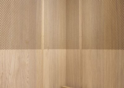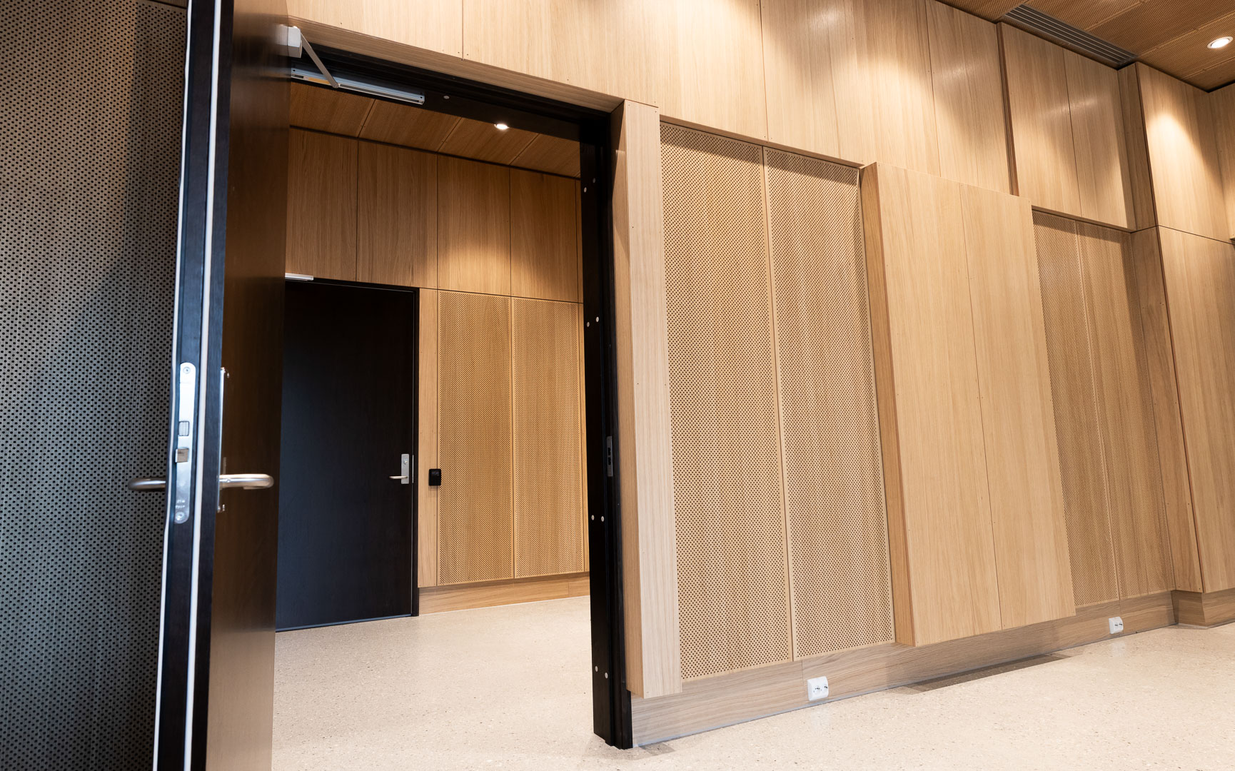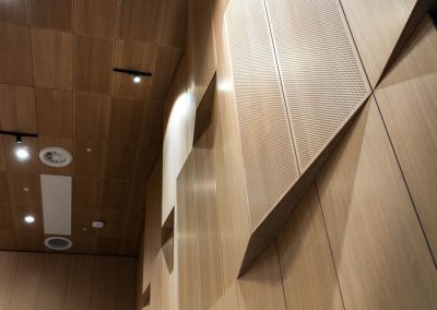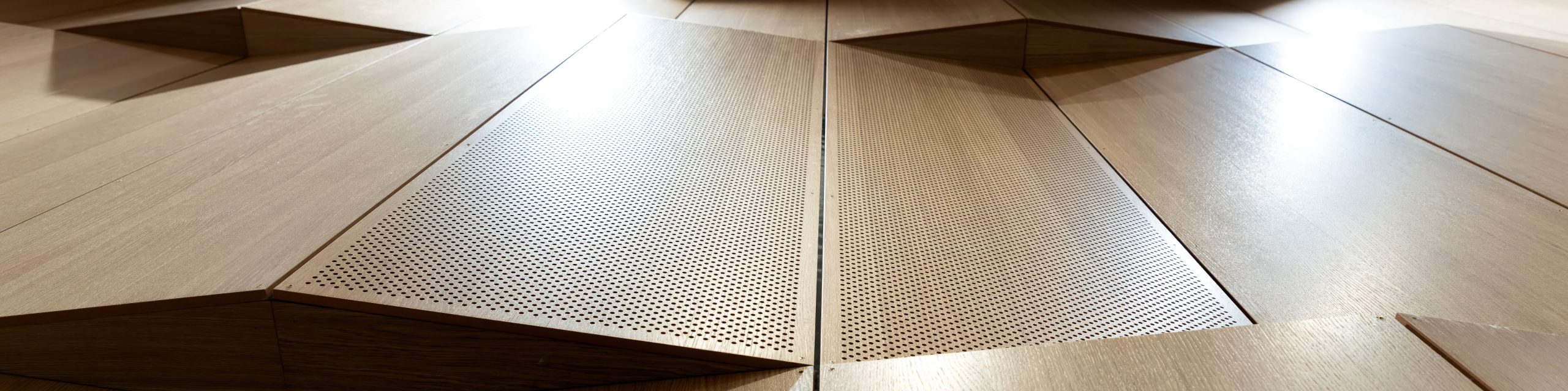 Auditoriet utmerker seg med sin unike arkitektur, hvor Otretek har montert perforerte og glatte plater på kassetter i spesielle vinkler. Dette skaper både et visuelt særpreg og et behagelig lydmiljø. I tillegg har vi levert veggpaneler med tredimensjonale mønstre i seremoni- og visningsrom, som bidrar til både estetikk og akustikk.